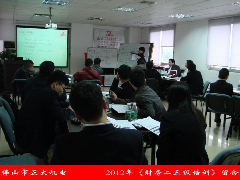 2012年2月25-26日,由正大機電公司人力資源部組織為期兩天一夜的《財務(wù)二三級培訓(xùn)》培訓(xùn)班在佛山市正大機電配套有限公司三樓會議室舉行;由正大機電公司下屬的配套系統(tǒng)(含財務(wù)部人員)、自動化系統(tǒng)、新尚投資系統(tǒng)控股公司的中高層管理人員、核心業(yè)務(wù)骨干、財務(wù)部門人員共25人參加了本次培訓(xùn)班學(xué)習。學(xué)習由佛山市正大機電配套有限公司人力資源部經(jīng)理湯運良先生主持。